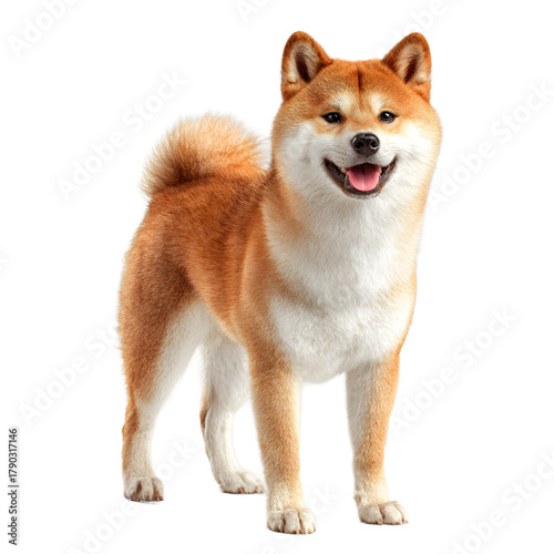 © Trendy Graphics, Naklejka premium A shiba inu dog with a fluffy tail curled over its back, standing and looking forward with a happy expression