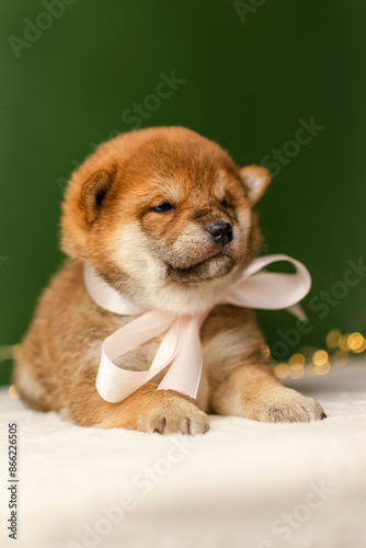 © love_dog_photo, Obraz premium A shiba inu puppy poses on a green background