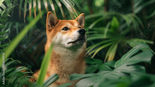 © LuvTK, Obraz premium A Shiba Inu with an abstract jungle background, lush greens and vibrant foliage, creating a wild and exotic atmosphere, hd quality, natural look. --ar 16:9 --v 6.0 --s 250 --style raw