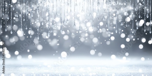 Fototapeta premium A shimmering background with hanging droplets and soft bokeh effects, creating a magical, wintry atmosphere.