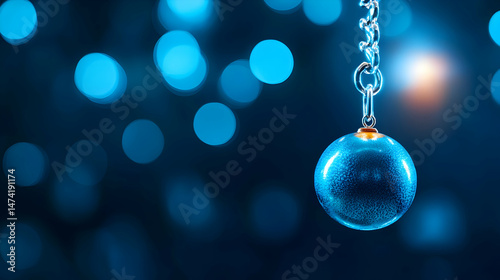 Fototapeta premium A shimmering blue sphere hangs from a chain against a bokeh background