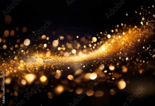 Naklejka premium A shimmering river of golden light and sparkles flows across a black background. The bokeh effect creates a magical, celebratory feel.
