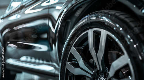 © Q77photo, Fototapeta premium A shiny black car with a chrome wheel