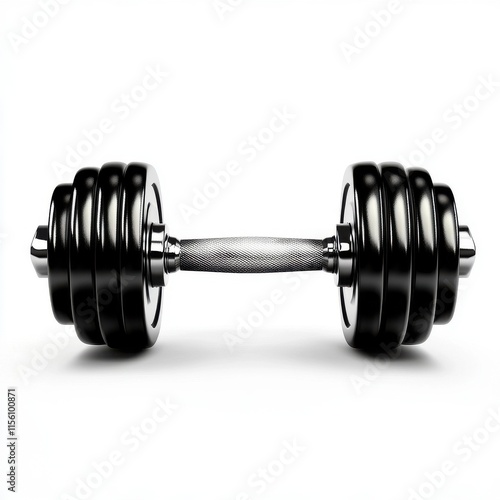 Naklejka premium A shiny black dumbbell resting on a white surface, representing fitness and...