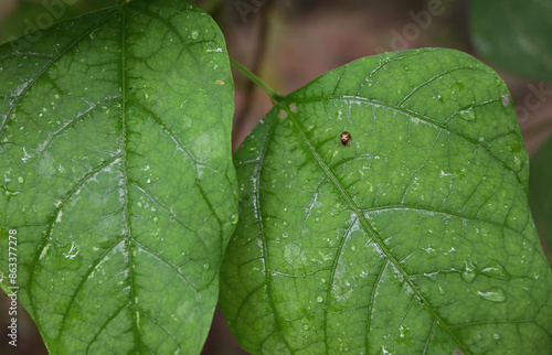 © Pics Man24, Fototapeta premium A shiny copper brown color beetle is eating on a rain soaked winged bean leaf surface