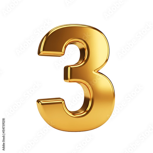 Fototapeta premium A shiny, golden, three-dimensional number three on a white background.