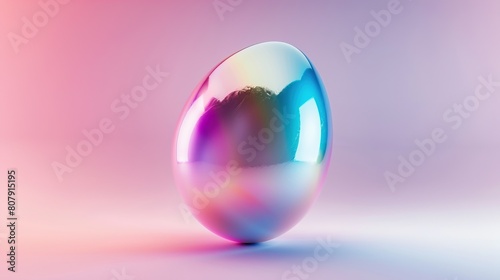 Obraz premium A shiny iridescent egg is sitting on a table. The background is a gradient of...