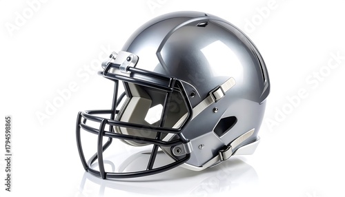Fototapeta premium A shiny, metallic silver and grey American football helmet isolated on a bright white background with a faint reflection