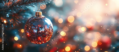Fototapeta premium A shiny red Christmas ornament hangs on a tree branch with warm blurry lights...