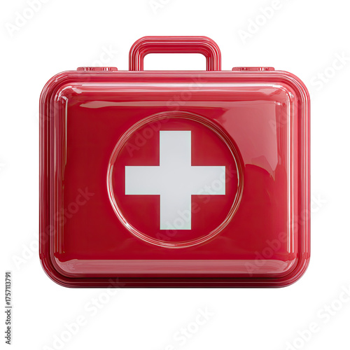 © Pixel, Obraz premium A shiny red rectangular first-aid kit with a prominent white cross