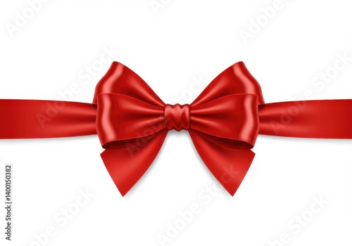 Fototapeta premium A shiny red satin bow centered on a white background with horizontal ribbon...