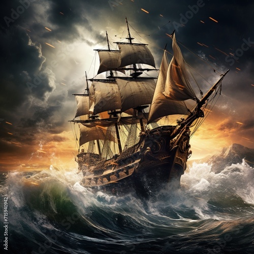 © therealnodeshaper, Naklejka premium a ship in the ocean during the storm created with Generative AI