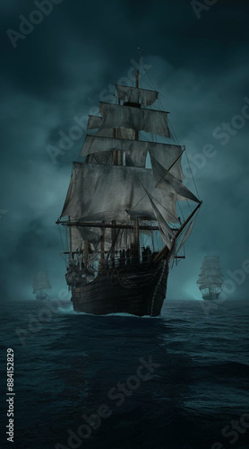 © Ja, Fototapeta premium a ship in the ocean with a dark sky behind it