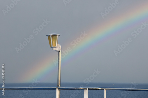 © DODOHAWE, Obraz premium A ship's lights against a backdrop of a rainbow before sunset at sea