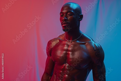 © Iryna, Obraz premium A shirtless African bodybuilder displays muscular strength and fitness, exuding masculinity and power.