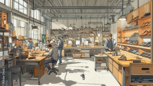 Naklejka premium a shoe manufacturing workshop with intricate detailing, workers assembling footwear, and tools neatly organized.