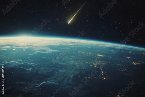 Fototapeta premium A shooting star flames through the dark twilight horizon of Earth, creating a dazzling phenomenon over the clear planet surface depicted in the cosmic backdrop.
