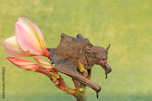 Obraz premium A short-nosed fruit bat eating frangipani flowers. This flying mammal has the scientific name Cynopterus minutus.