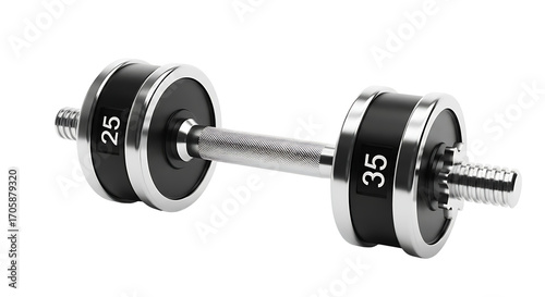 © Ubud, Naklejka premium A shot displays a chrome-plated dumbbell with black weight plates, highlighting the weight markers 25 and 35.