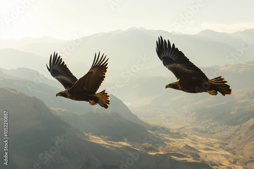 © Emily88, Fototapeta premium A shot of a bald eagle perched on a rocky cliff, overlooking a sweeping mountain range.