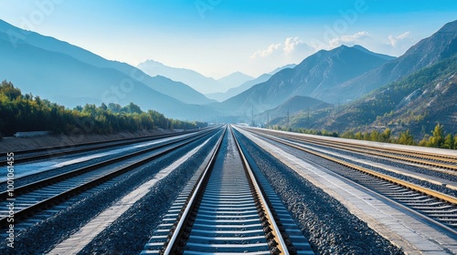 Fototapeta premium A shot of the high-speed train's tracks stretching into the distance, framed by scenic mountains and clear skies, symbolizing modern travel.