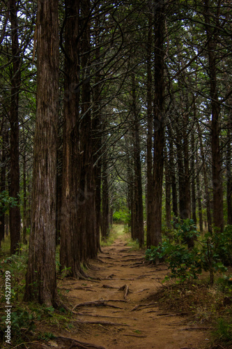 © Jaden, Fototapeta premium A shot of trees in the woods planted in a line and lined up, with a forest path