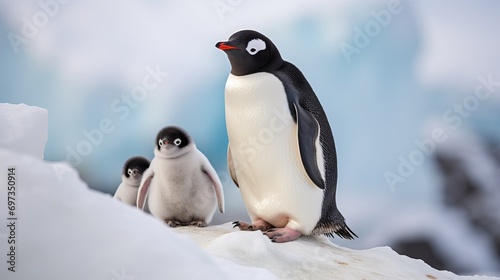 Naklejka premium A shot with a specific focus that shows a penguin and her babies in antarctica