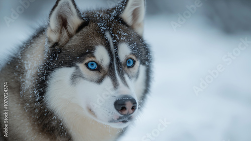 Naklejka premium A Siberian Husky in a snowy landscape with its piercing blue eyes and thick...