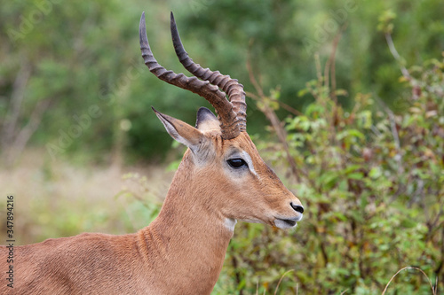 Naklejka premium A side profile of a wary impala (Aepyceros melampus) ram, during the day at the end of the wet season, in the South African bushveld.