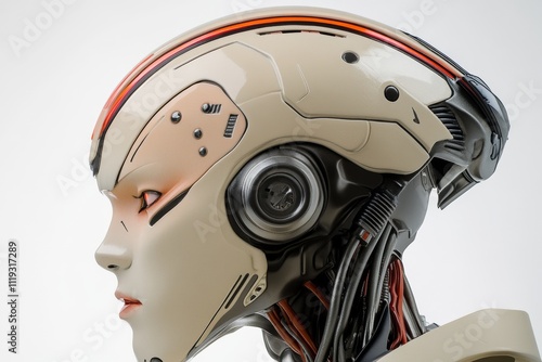 © c80, Fototapeta premium A side profile view of a sophisticated humanoid robot showcasing intricate mechanical detailing and a sleek, futuristic helmet design in a bright setting.