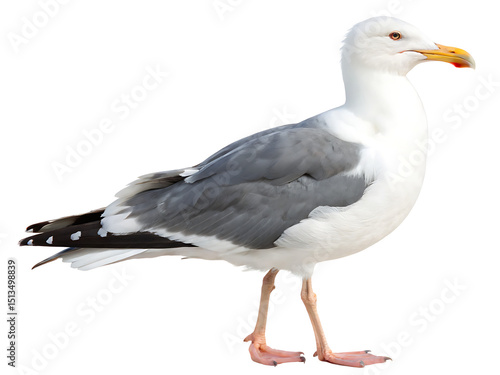 © jamal, Fototapeta premium A side view of a seagull with white and gray feathers standing against a white background in full view