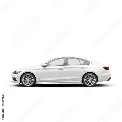 © Sheraz, Fototapeta premium A side view of a white sedan car showcasing its sleek design and modern features on a white background