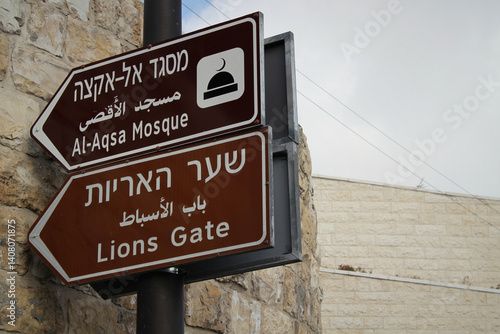 © Logan, Obraz premium A sign for the Lions Gate in the old city of Jerusalem.