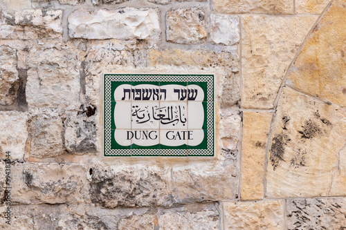 © svarshik, Fototapeta premium A sign in Hebrew, Arabic and English with the inscription - Dung Gate on the wall near the Dung Gate in the Old city of Jerusalem in Israel