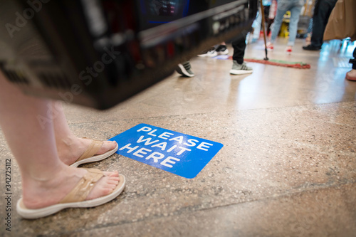 Obraz premium A sign on the supermarket floor urging to maintain social distancing due to...