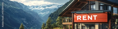 © Sarbinaz Mustafina, Obraz premium A sign that says rent is on a wooden post. The sign is in front of a cabin