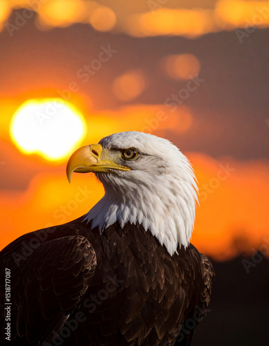 © Vitali, Fototapeta premium A silhouette of a bald eagle against a fiery sunset evokes American pride and the symbolism of freedom.