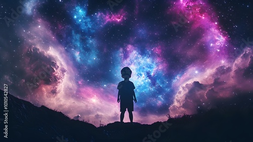 Fototapeta premium A silhouette of a child standing under a vibrant cosmic sky filled with stars and colorful nebula, symbolizing wonder and imagination.