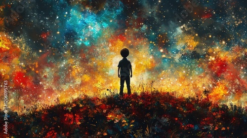 © PICK YOUR POV, Fototapeta premium A silhouette of a child stands against a vibrant cosmic landscape filled with colors and stars.