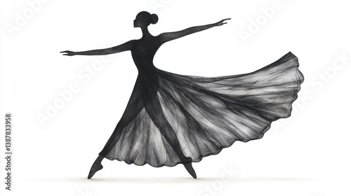 © Jeannaa, Obraz premium A silhouette of a graceful dancer in a flowing dress, capturing movement and elegance in a striking black and white composition.