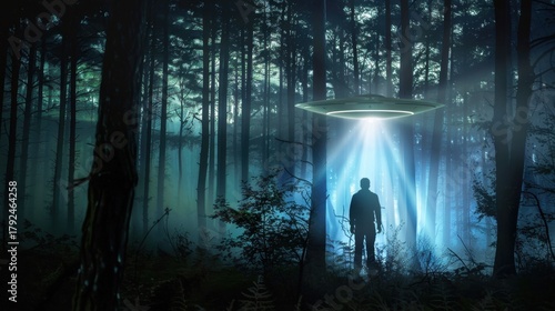 © ds17, Fototapeta premium A silhouette of a man stands in a dark forest, illuminated by a beam of light from a hovering UFO. The scene conveys themes of mystery and extraterrestrial life.