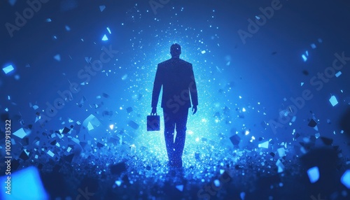 © Riz, Fototapeta premium A Silhouette of a Man Walking Through a Glowing Blue Field of Broken Shapes