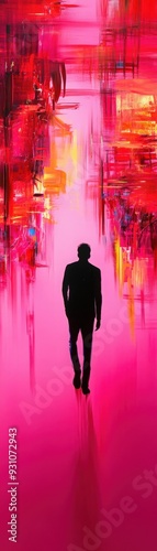 Obraz premium A silhouette of a man walking through vibrant, abstract shapes in a colorful,...
