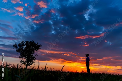 Obraz premium A silhouette of a person against a vibrant sunset sky with a lone tree.