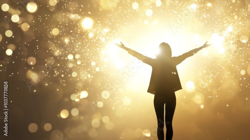 © Aris Suwanmalee, Naklejka premium A silhouette of a person celebrating in front of a bright, sparkling background, symbolizing joy, freedom, and positivity.