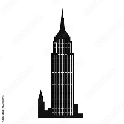 © Desain, Fototapeta premium A silhouette of a tall skyscraper with a pointed roof and multiple windows.