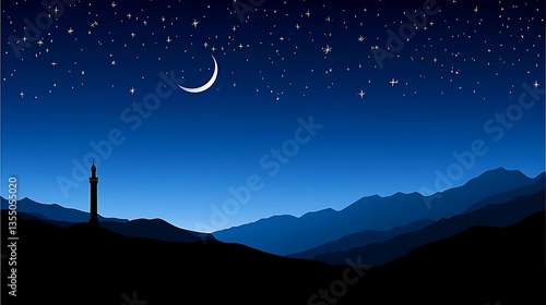 © Yahya, Naklejka premium A silhouette of a tower with mountains and stars at night