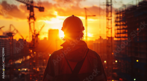 © Starkreal, Fototapeta premium A silhouette of an engineer wearing a helmet in front of a double exposure of a construction site in soft sunset light