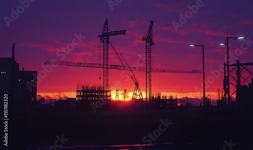 Fototapeta premium A silhouette of construction cranes against a vibrant sunset backdrop.