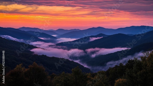 Obraz premium A silhouette of mountains against a colorful sunrise sky, with layers of clouds and mist creating a dramatic and serene scene, perfect for nature enthusiasts
